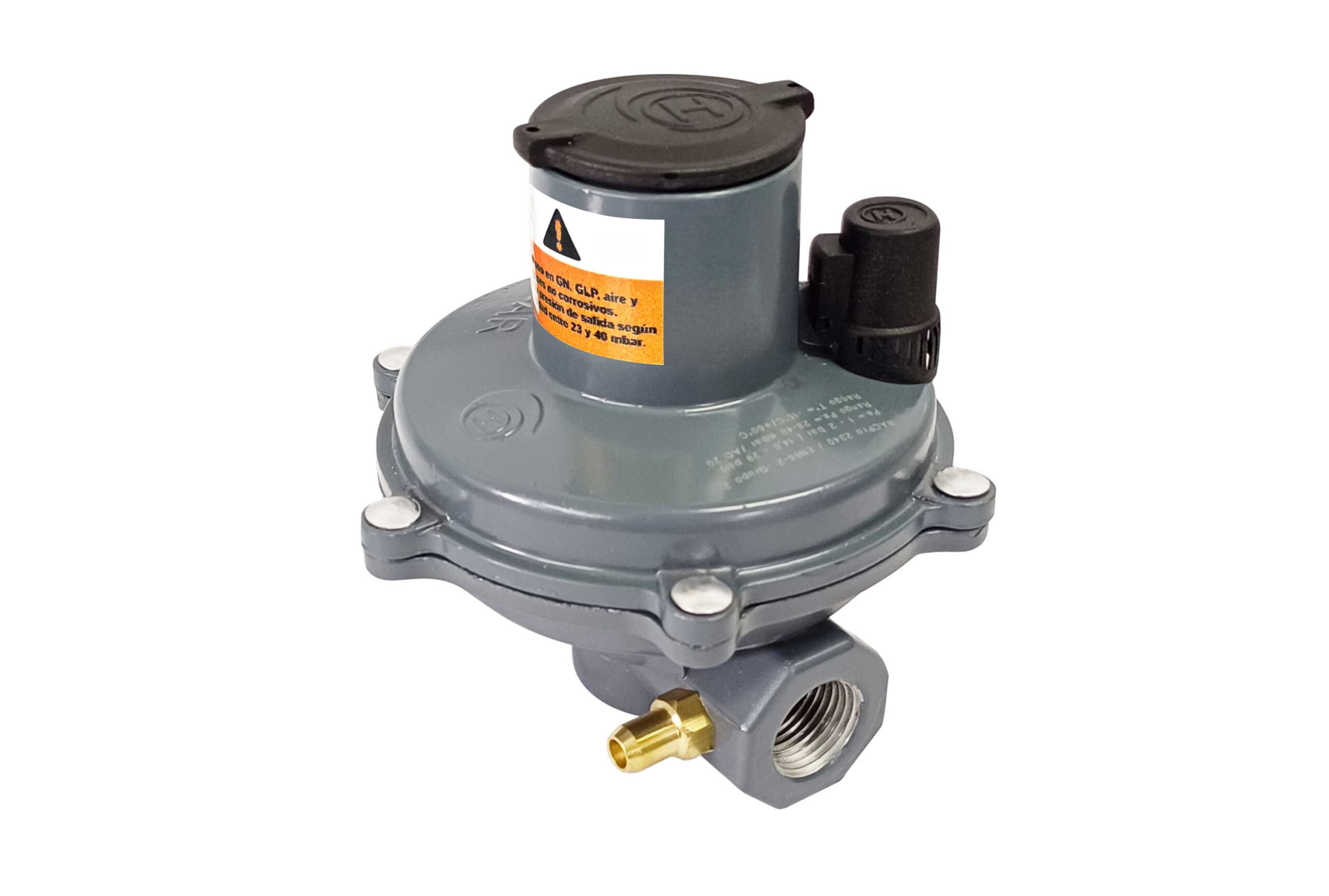Presión de Entrada mín. 1bar (14,5 psi). Presión de Entrada máx. 2 bar (29 psi). Presión de Salida 23-40 mbar ( 9,2 – 16″c.a.). Caudal con presión de entrada de ajuste 20 – 30 m³/h GN 1.150.592 – 1.725.888 BTU/h GLP. Conexión Entrada 1/2” NPT h Conexión Salida 1/2” NPT h.